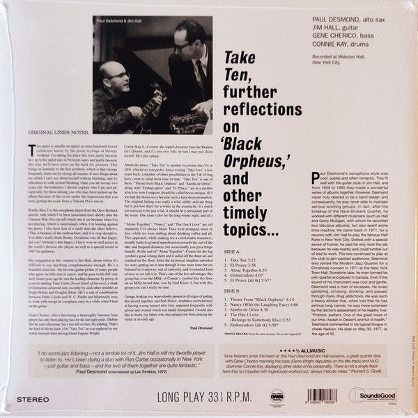 Paul Desmond’s saxophone style was cool, subtle and often romantic. This fit well with the guitar style of Jim Hall, and from 1959 to 1965 they made a wonderful series of albums together, among them Take Ten, presented here in its entirety, which focuses of bossa nova-like tunes. The title tune follows the path of Desmond’s celebrated composition “Take Five”, which he had recorded with the Dave Brubeck Quartet on the iconic Time Out LP.