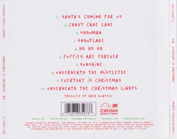 Everyday Is Christmas by Sia, released 16 November 2017, includes the following tracks: “Snowman”, “Ho Ho Ho”, “Sunshine”, “Everyday Is Christmas” and more.
