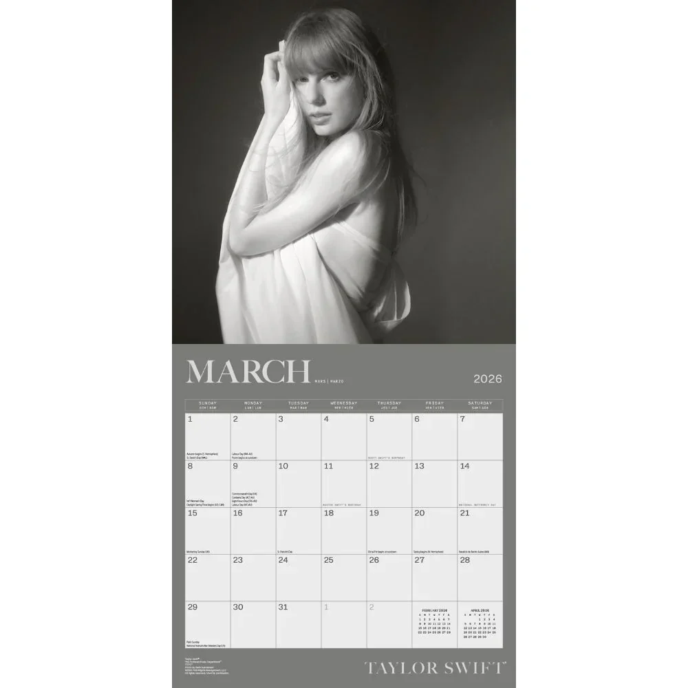 Taylor Swift Official Calendar is a calendar for the year 2026. The calendar is a(n) Pop Music Wall (30x30cm) calendar.